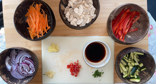 - Finely chop up all the vegetables so that they are ready to be cooked.