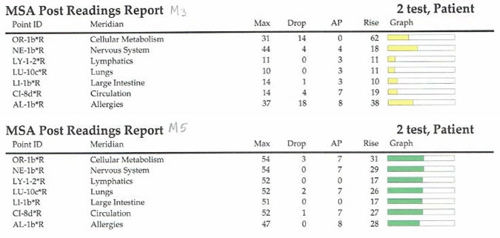 The graphs below are samples from an electrodermal testing research study showing the results of one subject measured when making a cell phone call without (top) and with (bottom) an EMF Harmony Mobility+ bracelet. The results indicate that all of the measured parameters were below the optimal levels without the bracelet, and they all reached an optimal level with the bracelet. Similar results were found for all five test subjects.