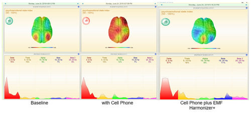 The figure below shows measurements taken with a HeartQuest heart rate variability (HRV) device. On the left are baseline readings from a test subject, in the middle are results after a 5 minute unprotected cell phone call, and on the right are results after a 5 minute cell phone call with the EMF Harmonizer+ attached to the phone. The top figures show the test subject’s psycho-emotional state index, which dropped from the baseline 65% to 30% after the unprotected cell phone call, and increased to 70% after using the cell phone with the Harmonizer+ attached (better than baseline). The bottom figures show the subject’s brainwave measures for delta, theta, alpha, beta and gamma rhythms.