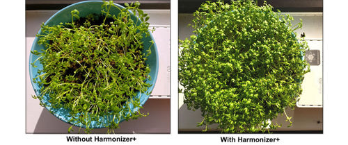 This test provides a visual demonstration of the negative effects of EMF radiation on the growth of cress sprouts, and how the EMF Harmonizer+ minimized these negative effects. The test includes sprouts grown next to a WiFi router emitting measurable EMF radiation, and a control group of sprouts grown 8 feet away with no exposure to EMF radiation. On the left is a picture of the sprouts grown next to the router without EMF protection, and on the right are the sprouts grown with the Harmonizer+ on the router.